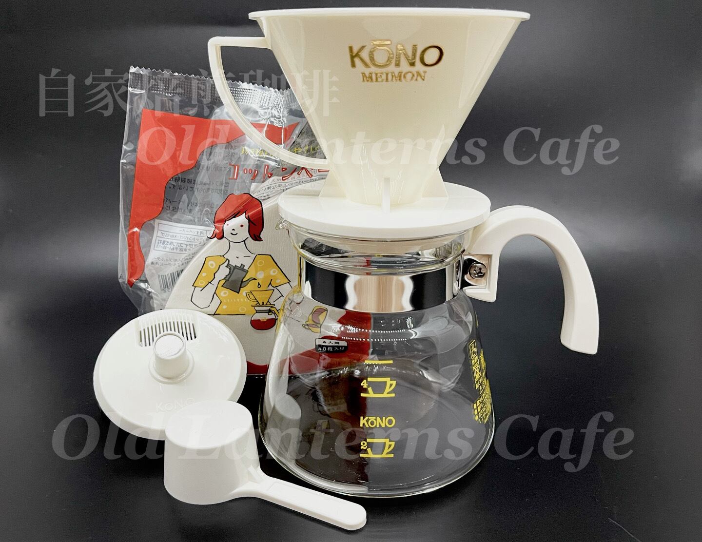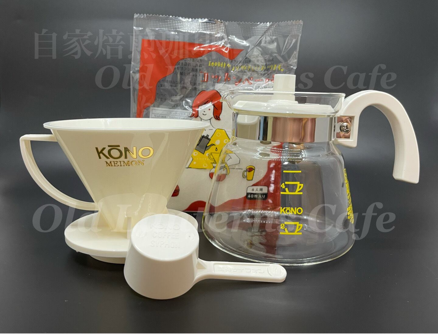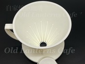 名門フィルター:ホワイト(円錐)、同色グラスポット、同色計量カップ、円錐コットンペーパー40枚
