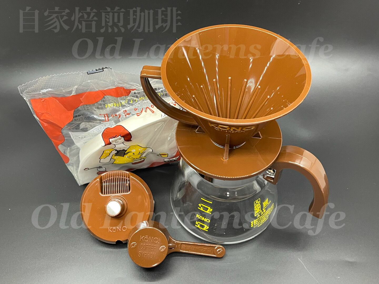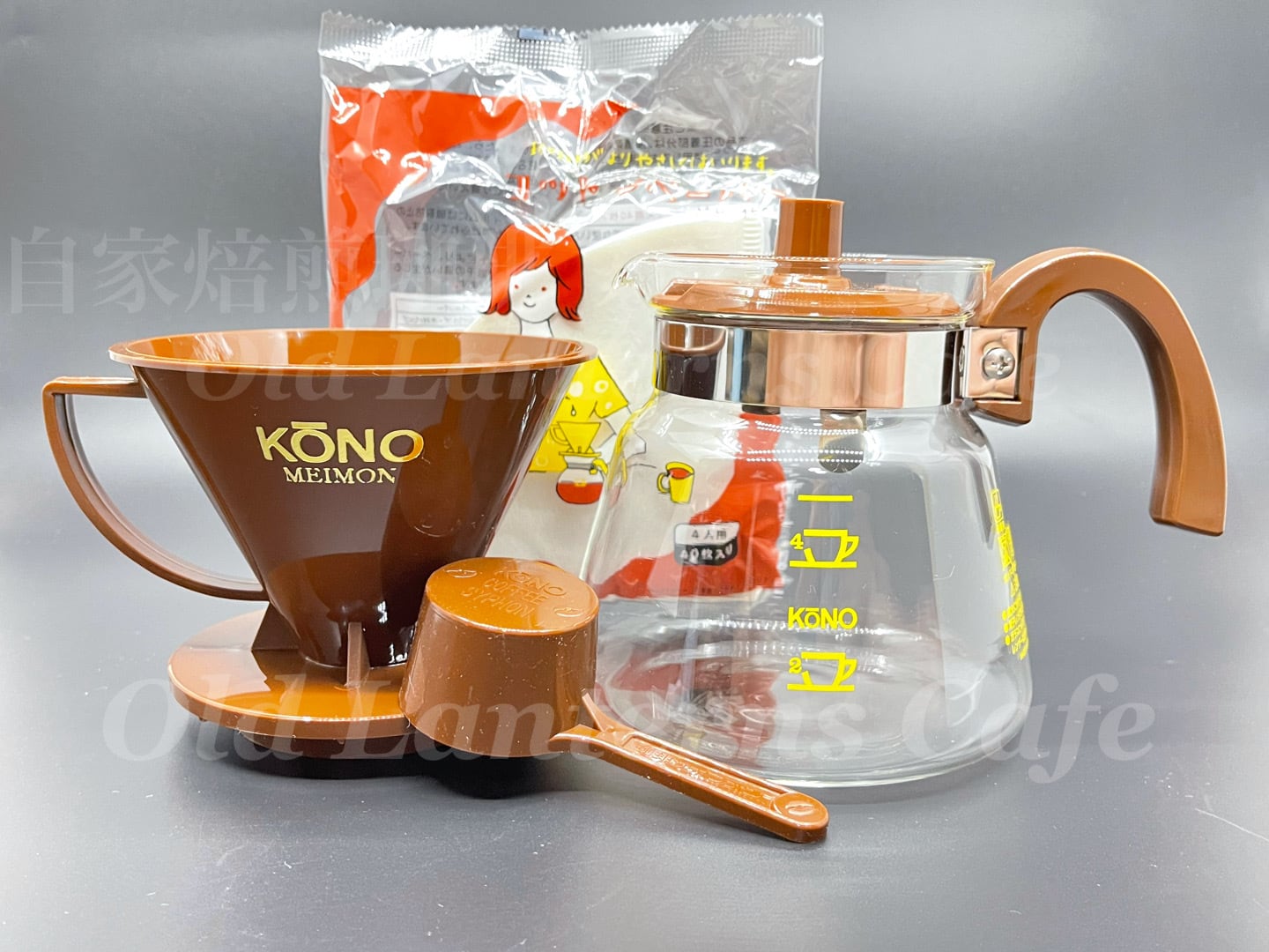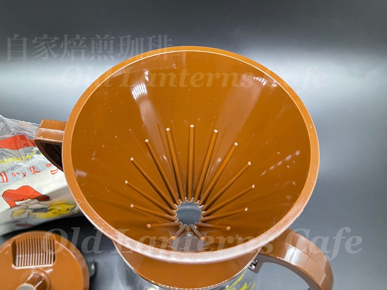 名門フィルター:チョコレート(円錐)、同色グラスポット、同色計量カップ、円錐コットンペーパー40枚