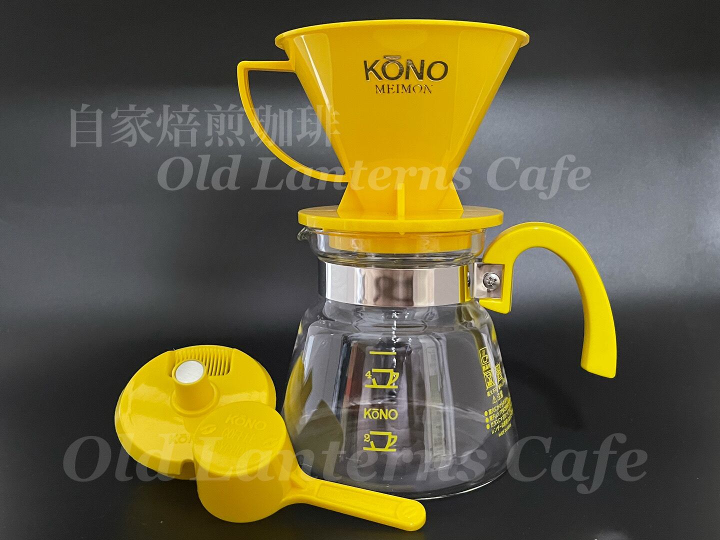 名門フィルター:イエロー(円錐)、同色グラスポット、同色計量カップ、円錐コットンペーパー40枚